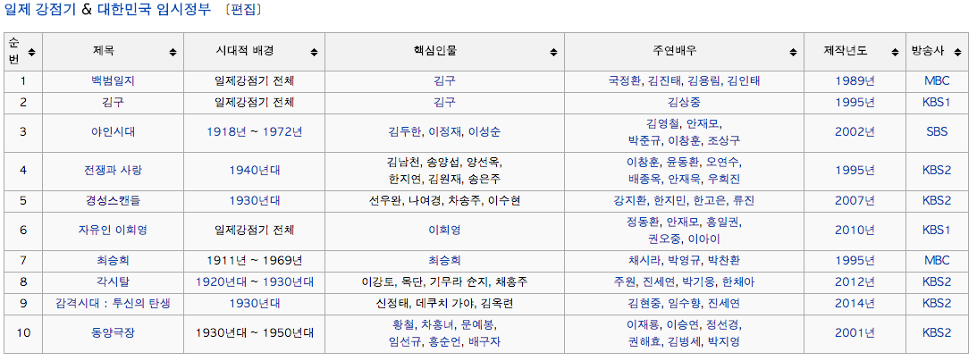 这些是1989~2014年韩国电视台拍的关于日本殖民时代的电视剧,其中只有几个是符合「抗日」定义,其余多是以那个时代为背景的传记剧或者爱情剧。