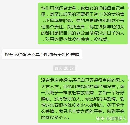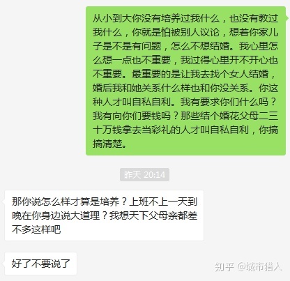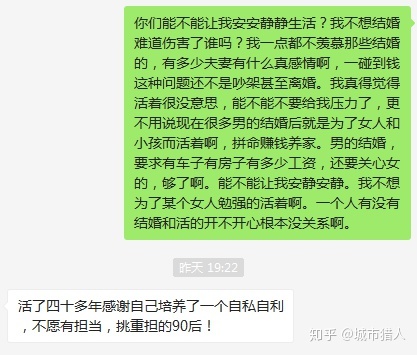 以上是我的一位大学毕业两年的男性读者与他妈妈的聊天记录(他本人同意我发出来)。他毕业后没有向父母伸手要钱了,就是不大想结婚。但是他的妈妈觉得他不结婚的想法很不对、很没有担当。